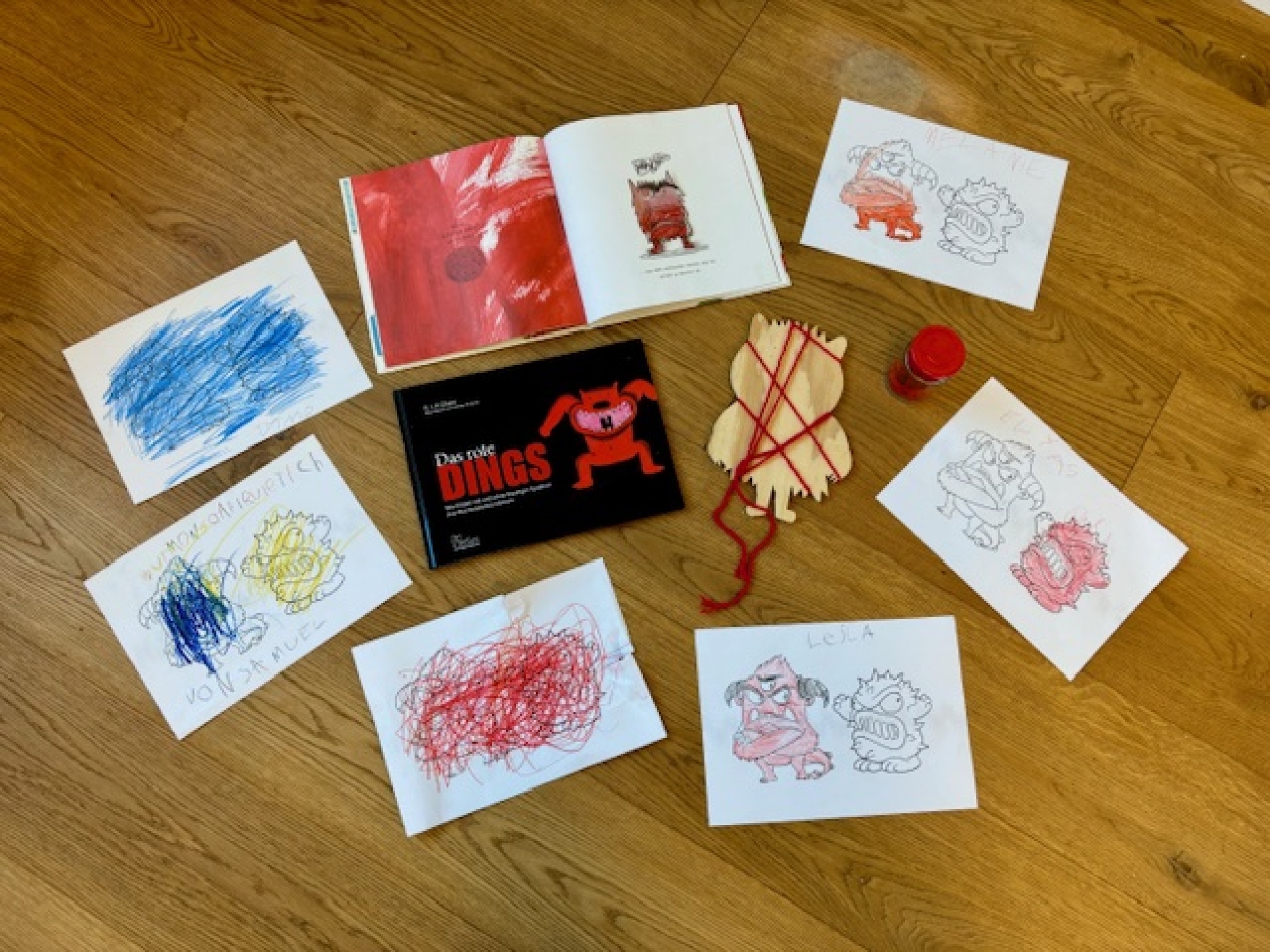 Anhand des Buches «Das rote Dings» setzten sich die Kinder sich mit dem Gefühl Wut auseinander. Dieses Gefühl kennen alle, weshalb Strategien im Umgang damit ausgetauscht wurden. Hierbei lernten die Kinder, wie Wut entsteht (Anschauung durch das Experiment Wutvulkan) und wie sie mit diesem Gefühl umgehen können (Durchlaufen von Stationen, an denen unterschiedliche Strategien vorgestellt und ausprobiert werden konnten).