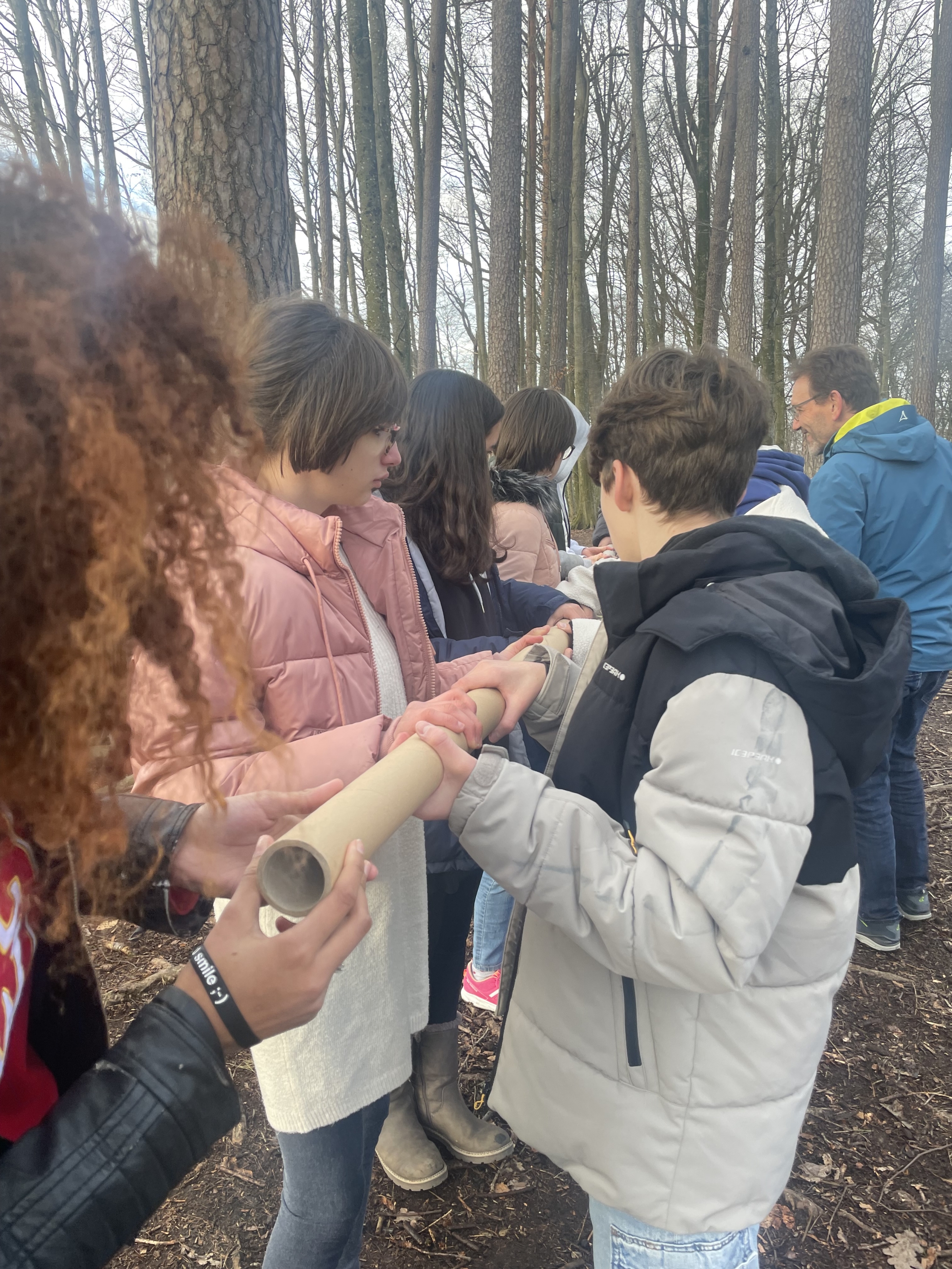 Frau Ferraro ist Erlebnispädagogin und hat die Inhalte des Fachs gestaltet und durchgeführt. Hauptsächlich befassten sich die Schülerinnen und Schüler in diesen 90 Minuten mit sich selbst und der Gruppe. So sollten sie gemeinsam und ohne Hilfe Feuer machen, eine Waldkugelbahn erfolgreich benutzen, Erlebnispfade blind durchlaufen oder ohne zu sprechen gemeinsam ein Kapla-Kunstwerk bauen.
