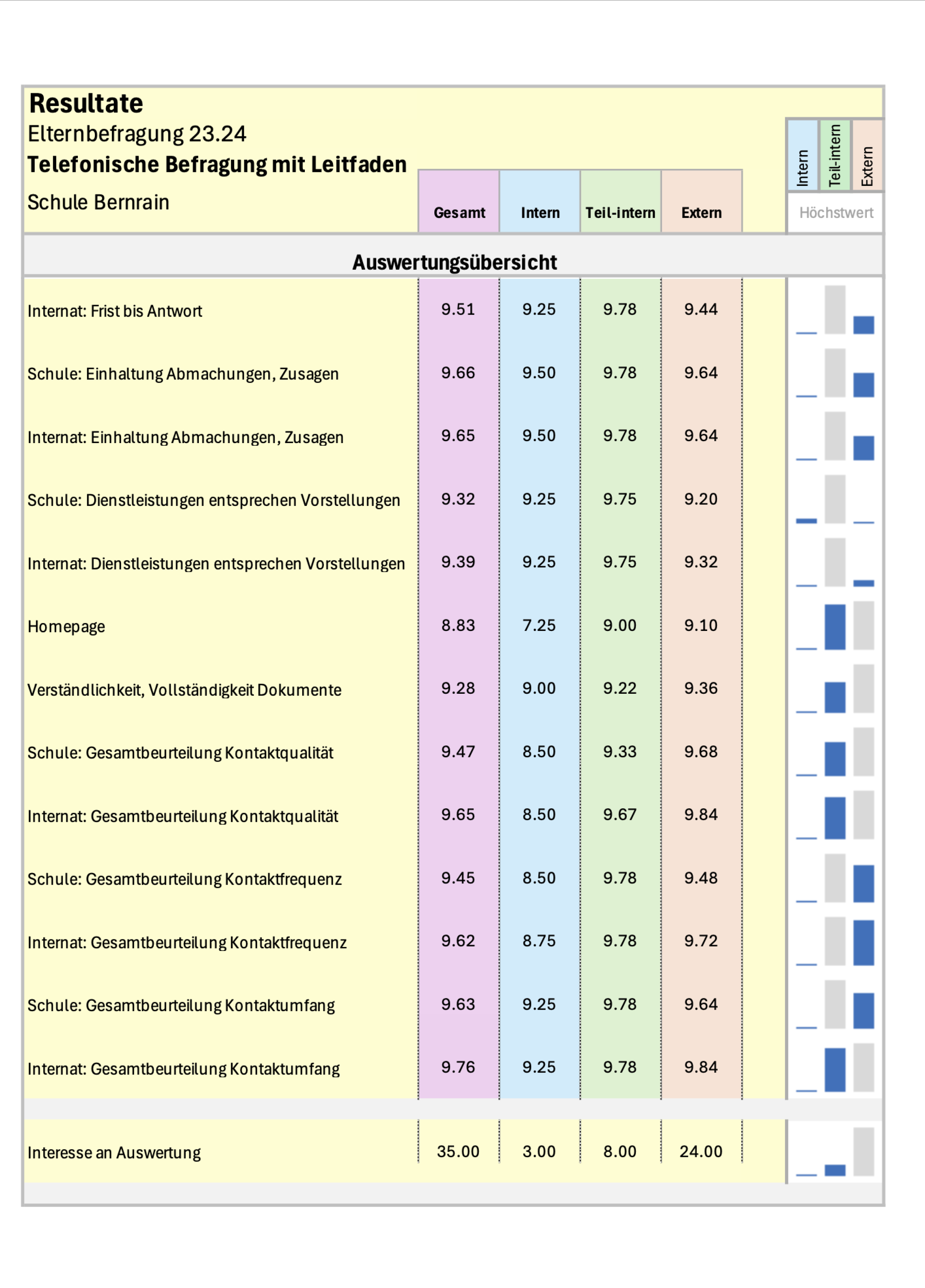 Die Eltern unserer Schülerinnen und Schüler hatten auch dieses Jahr die Möglichkeit unserere Schule zu bewerten. Die Umfrage wurde im Frühling telefonisch durchgeführt.
